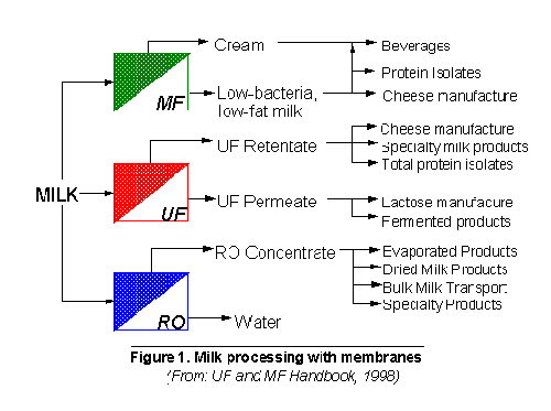 The University of Illinois at Urbana-Champaign has a history of research and development in dairy technology stretching back to the early 1900s. Research on the application of immobilized enzymes and membrane technology in milk and whey processing began in 1975. The potential application of membranes in the dairy industry is vast, as shown in Figure 1 for milk and in Figure 2 for cheese whey. Current estimates are that over 300,000 square meters of membrane area are installed in the dairy industry worldwide. Present usage is weighted towards reverse osmosis (RO) and ultrafiltration (UF), although there are expectations of significant growth in microfiltration (MF) and nanofiltration (NF) in the next decade.