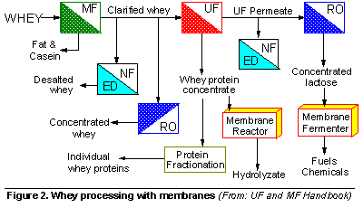 A good example of the successful application of membrane technology, and ultrafiltration in particular, is the processing of cheese whey. Whey is a by-product of the cheese industry. It is the liquid fraction that is drained from the curd during the manufacture of cheese. Typically every 100 kg of milk will give about 10-20 kg of cheese depending on the variety, and about 80-90 kg of liquid whey. Its disposal is a major problem for the dairy industry, partly due to its composition. It has a low solids content and a very unfavorable lactose:protein ratio which makes it difficult to utilize as-is. The biological oxygen demand (BOD) is 32,000 to 60,000 ppm, which creates a very severe disposal problem. Despite continuing efforts to find uses for the whey, either as-is or in dry form, or its major components (high quality protein and lactose), it is estimated that as much as 40-50% of the whey produced is disposed off as sewage, with the rest being used primarily for animal feed or human food. World production is estimated at 80 to 130 million tons per year with USA producing about 30 million tons per year. Since cheese consumption is increasing around the world, we can assume that the whey disposal problem is getting worse. This explains why membrane technology has attracted the attention of cheese and whey producers: the appropriate membrane can simultaneously fractionate, purify and concentrate whey components, thus enhancing their utilization and reducing the pollution problem. Figure 2 shows a general schematic of possible applications of membranes in whey treatment.