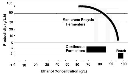 The graph illustrates the improvements to be expected with the membrane-based fermenters. In laboratory trials, productivities 10-50 times higher than batch fermenters have been obtained. Other benefits have been observed: